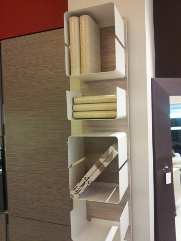 Libreria da muro con schiena larice e mensole metallo bianco.