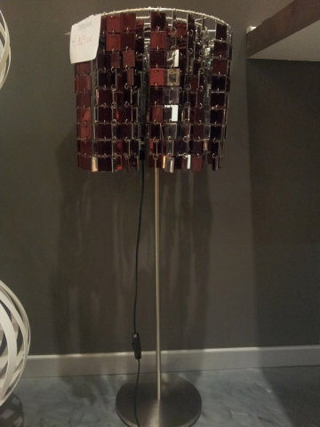 Lampada da tavolo con tessere rosso/viola e basamento in acciaio satinato.