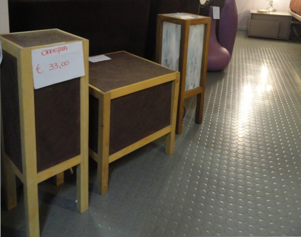 Lampade di legno in varie misure con paralumi in tessuto e vetro.