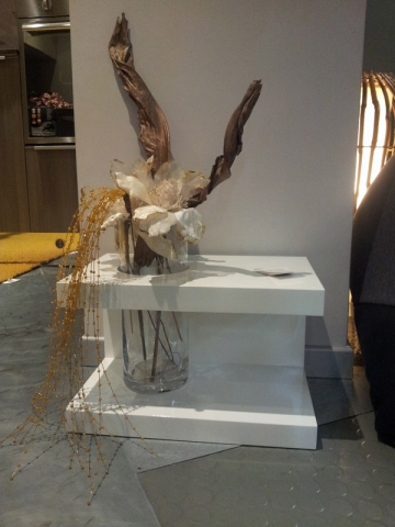 Centrotavola laccato lucido bianco con vaso in vetro trasparente incassato.