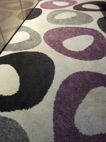 Tappeto beige con decoro a cerchi grigio, nero e viola.